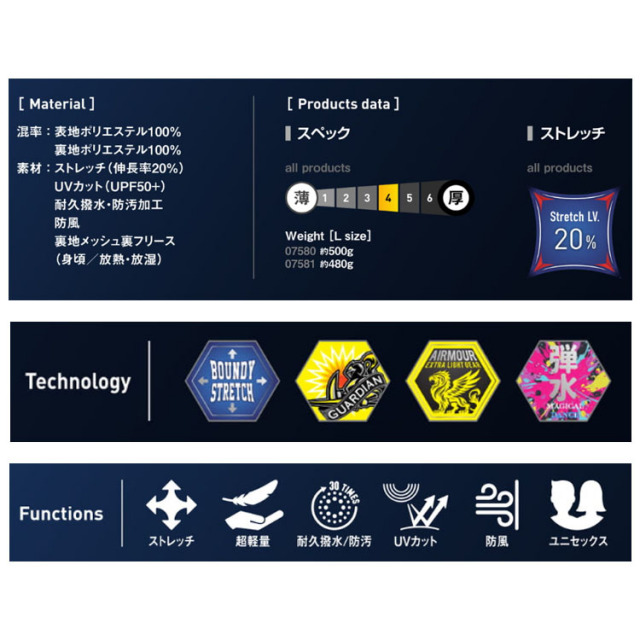 【素材 ストレッチ(伸長率20%)、UVカット(UPF50+)耐久撥水・防汚加工、防風 裏地メッシュ裏フリース(身頃/放熱・放湿)】