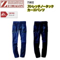 【裾直無料】【春夏】Z-DRAGON ストレッチノータックカーゴパンツ 75602 73-112 ストレッチデニム ワンポイント カン 革レベル 人工皮革 綿 65% ポリエステル 33% ポリウレタン2% 夏用 自重堂 目玉