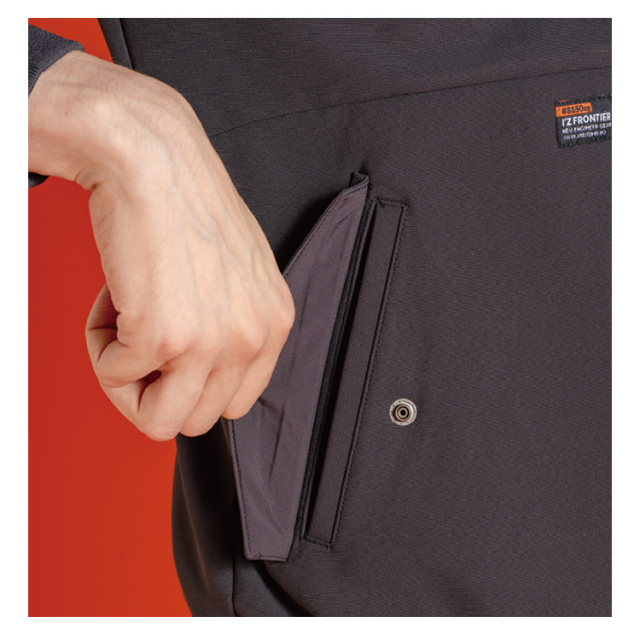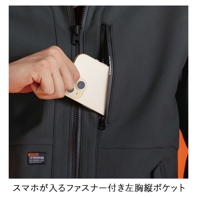 ●スマホが入るファスナー付き左胸縦ポケット