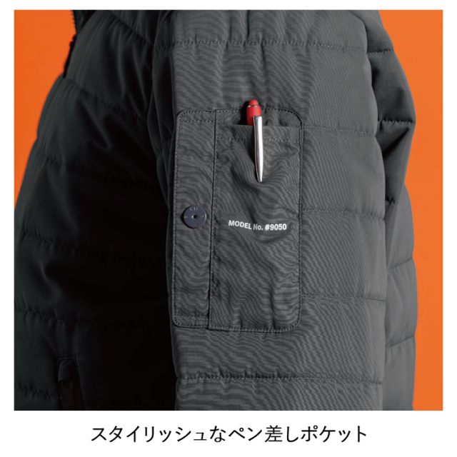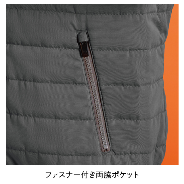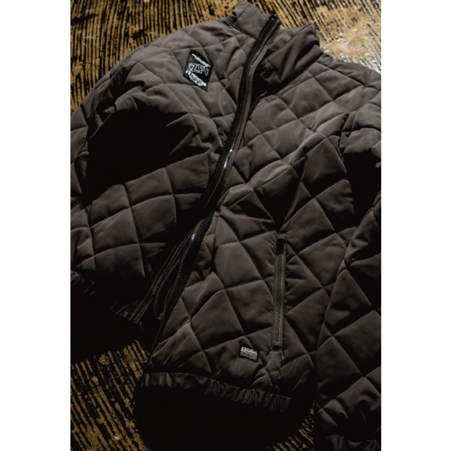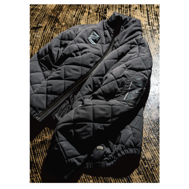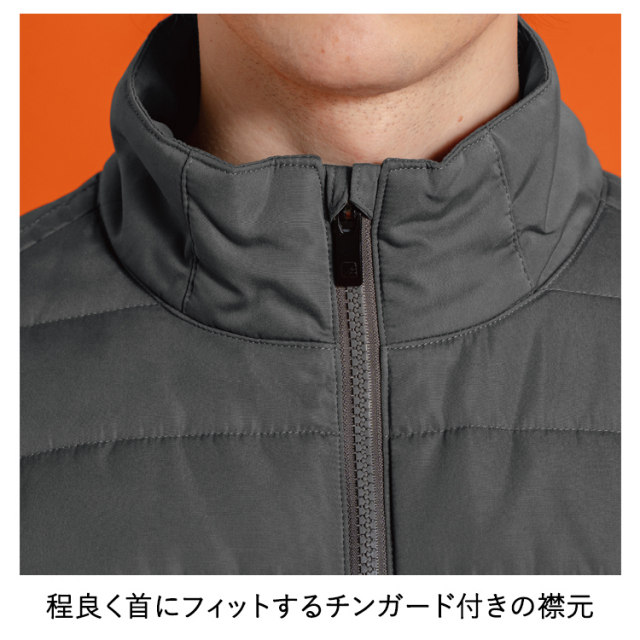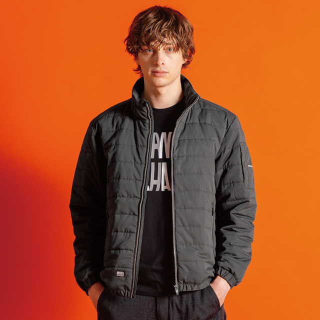 ■敢えて中綿を100g/m2に抑え手軽に羽織れる便利さが最大の魅力。表生地には細番手の糸を高密度に打ち込んだハリ感とピーチ起毛した上質な表面感により、強度と高級感あるルックスを両立した生地を採用し、防寒服としてのクオリティーを高めています。