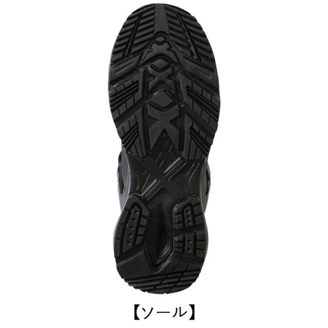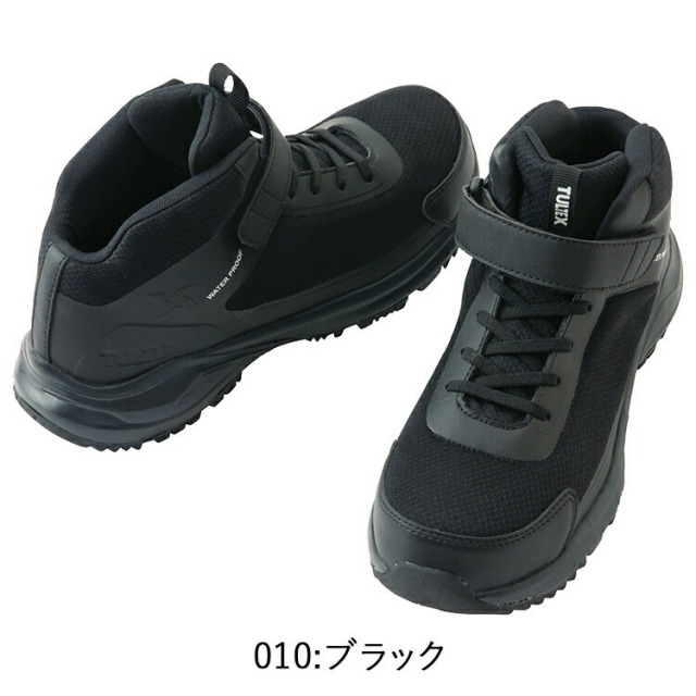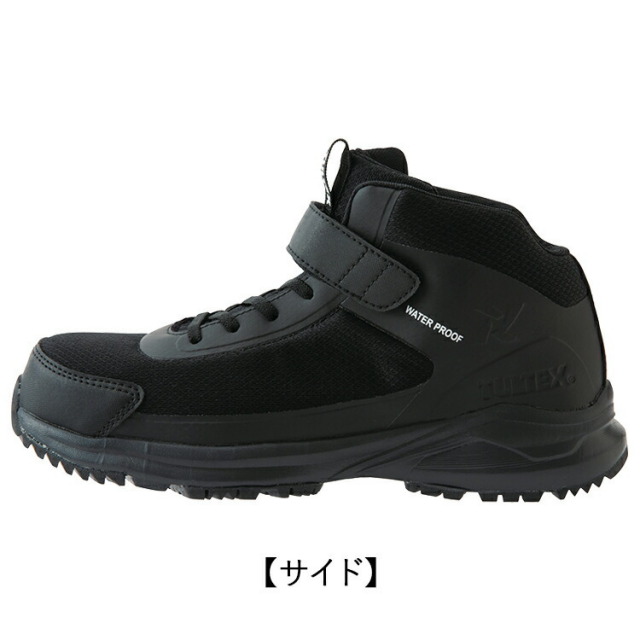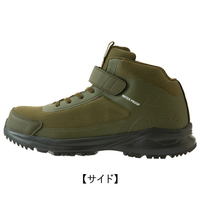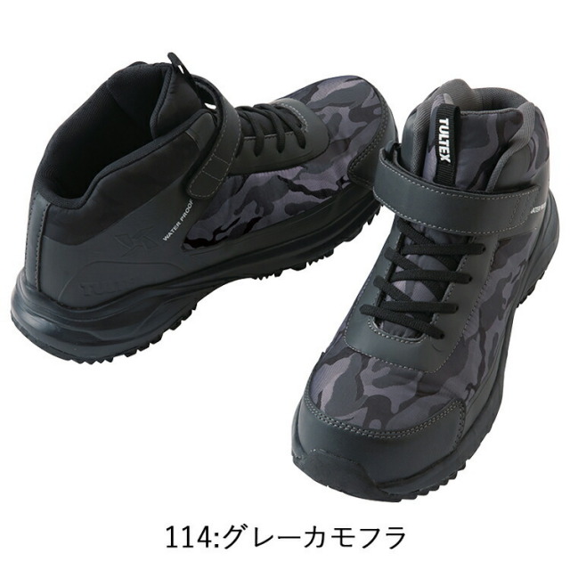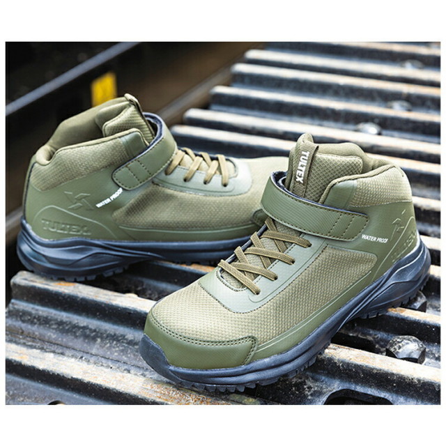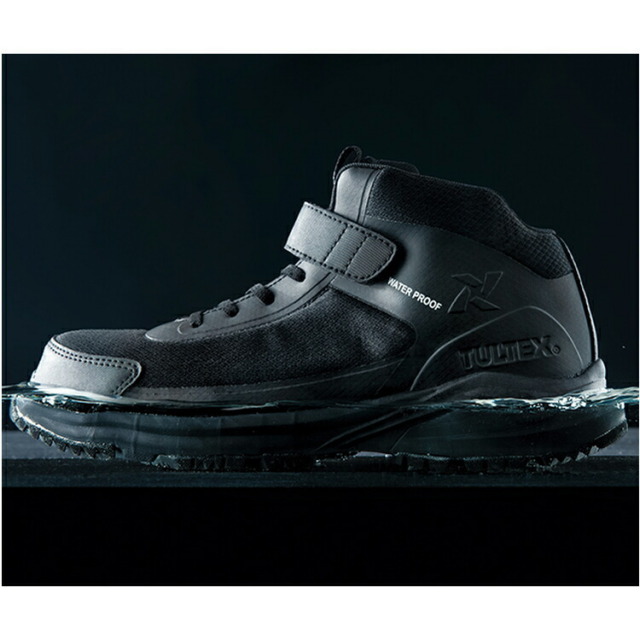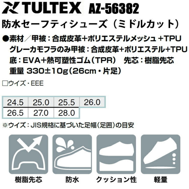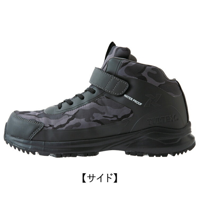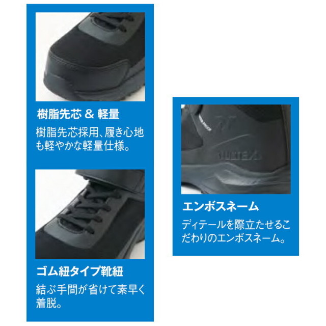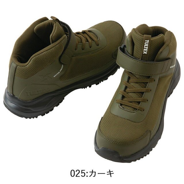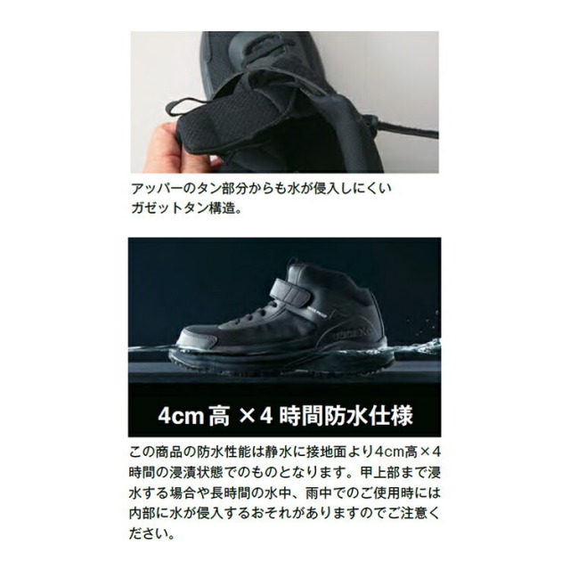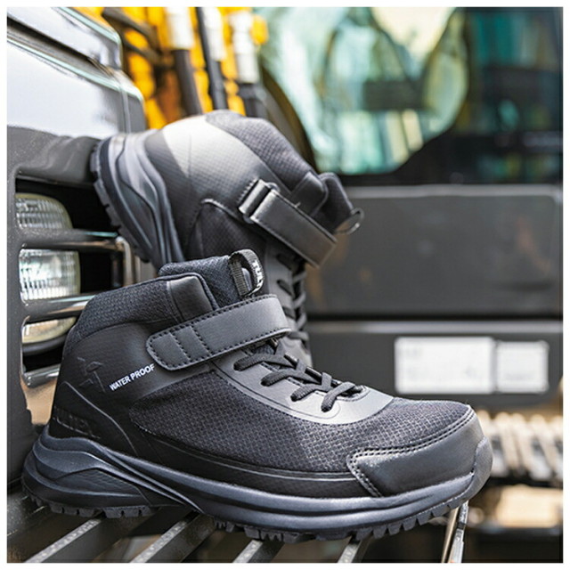 軽度防水仕様で小雨時に作業が可能、ゴム紐タイプの靴紐を採用し看脱の手間が省ける。ミドルカットと面ファスナー止めでくるぶしまでしっかりと保護。