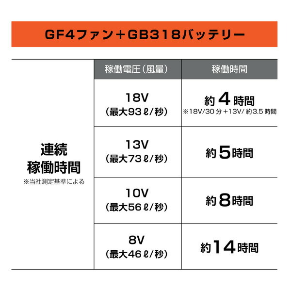 ※18V電圧(風量)は30分の使用で自動的に13Vに切り替わり約3.5時間稼働します。