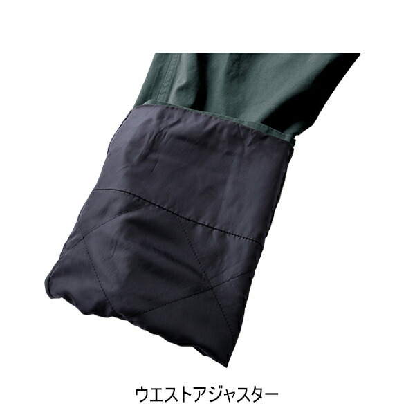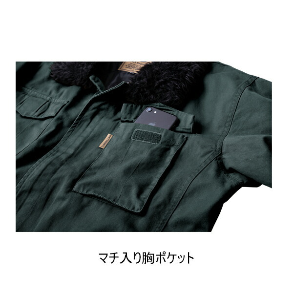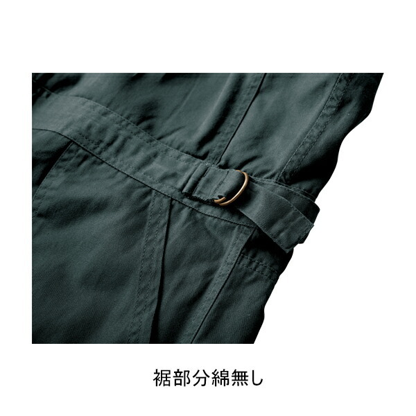■表素材はタフさと洗い加工によるしなやかさのあるコットンを使用し、裏地にキルティングした中綿で保温性を確保したハードワーカー用の防寒ツナギ。