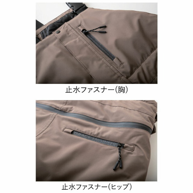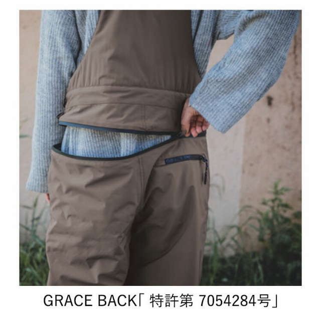 ●アウターを着る時期こそ、トイレ問題で重宝される“特許取得のヒップオープン機能” に、表生地は防風防水で耐水圧15,000mm、透湿度5,000g/m2・24h と本格プロ仕様なサロペットです。
