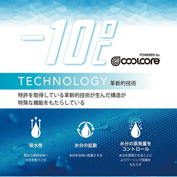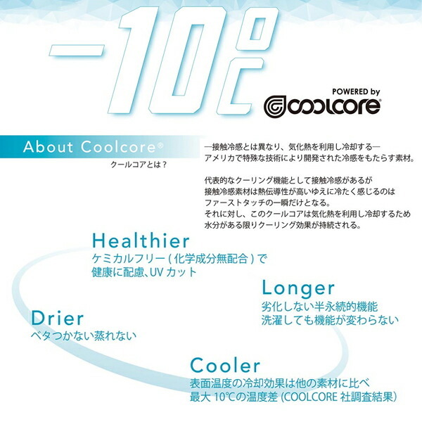 「クールコア」とは、接触冷感とは異なり、気化熱を利用し冷却する。