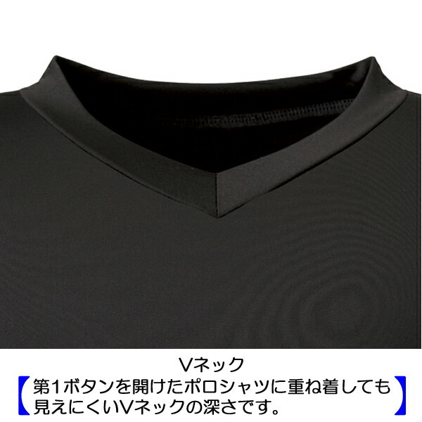 Vネック仕様で、第1ボタンを開けたポロシャツに重ね着しても見えにくい深さです。
