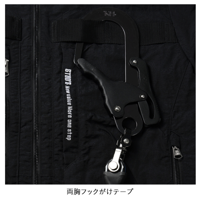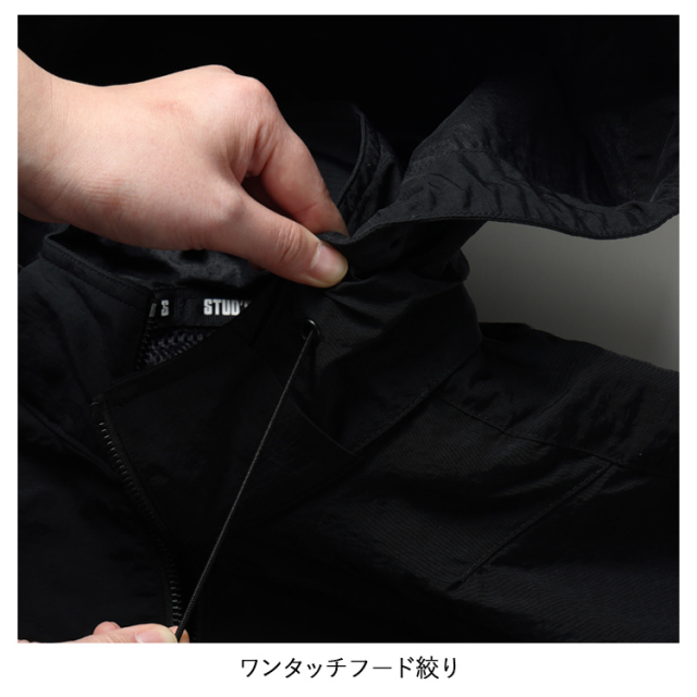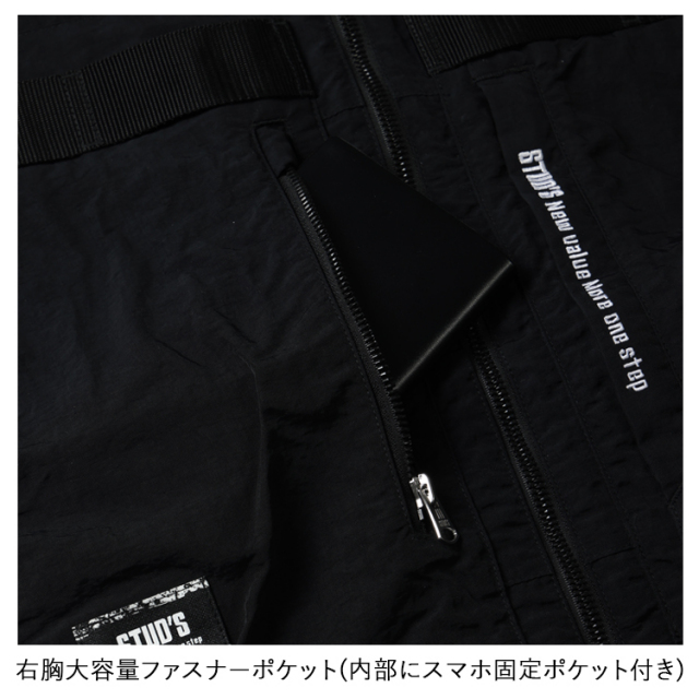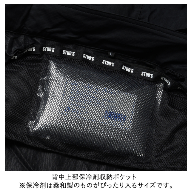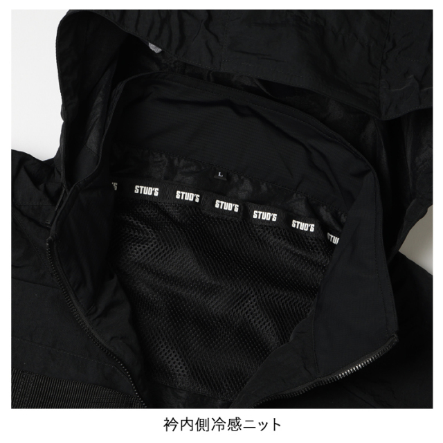 ・生地の表に高級感のあるシワ加工、裏に遮熱性を高めるシレー加工を施したハイクオリティな素材とEFウェアには見えないデザイン性の高さがラグジュアリーな雰囲気を放つハイスペックウェアはスタッズでしか味わえません。