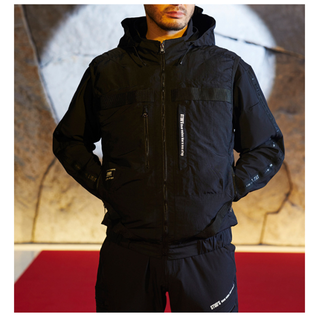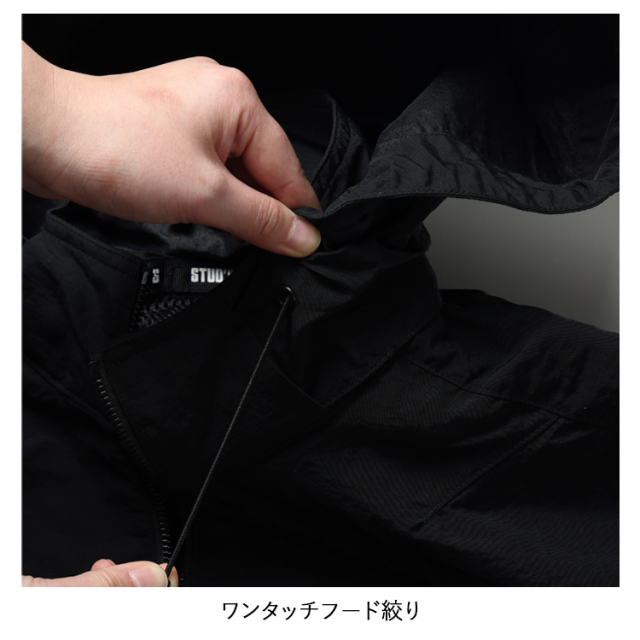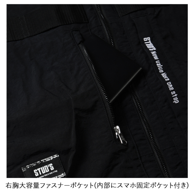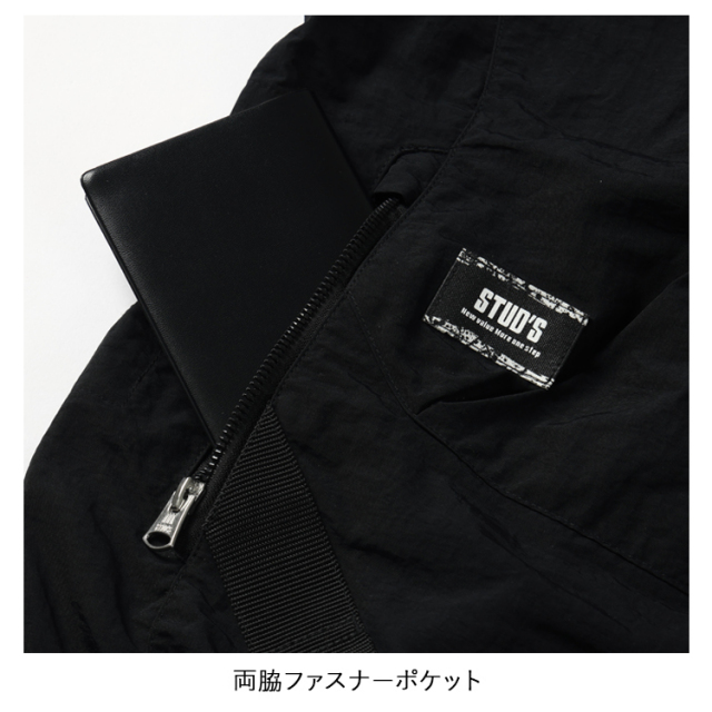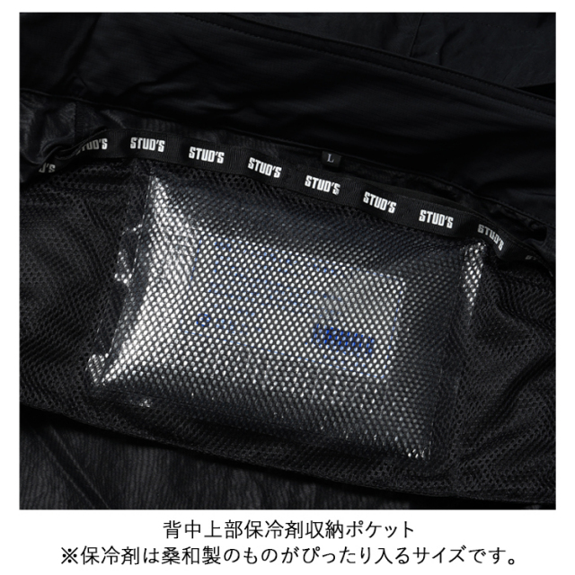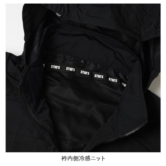・生地の表に高級感のあるシワ加工、裏に遮熱性を高めるシレー加工を施したハイクオリティな素材とEFウェアには見えないデザイン性の高さがラグジュアリーな雰囲気を放つハイスペックウェアはスタッズでしか味わえません。