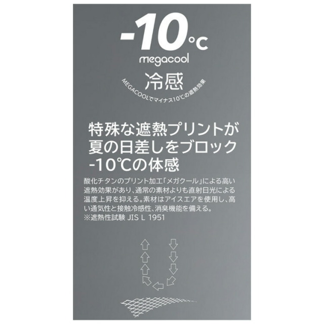 ・酸化チタンのプリント加工「メガクール」による高い遮熱効果があり 通常の素材よりも直射日光による温度上昇を抑える。