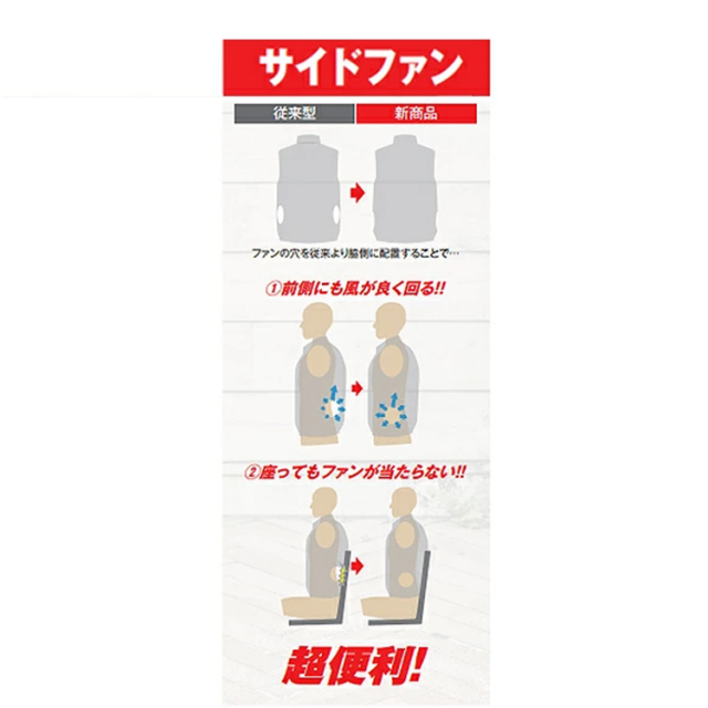 ▲新開発サイドファン [車の運転や椅子に座った状態でもファンが邪魔にならない][身体の前後に風が回る]