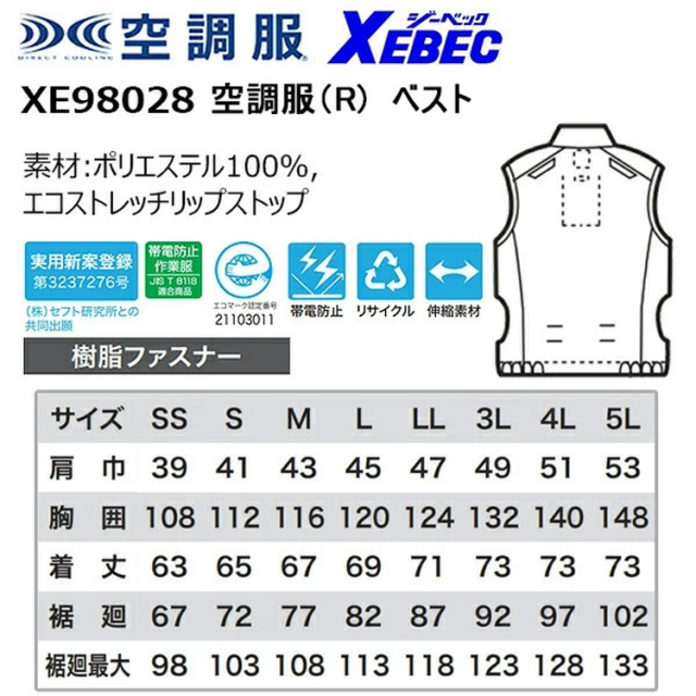【4L-5L】【服単品】XEBEC ジーベック 空調服 XE98028 空調服(R) ベスト 4L-5L JIS制電タイプ 帯電防止 リサイクル 伸縮素材 空調ウエア 作業服