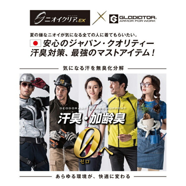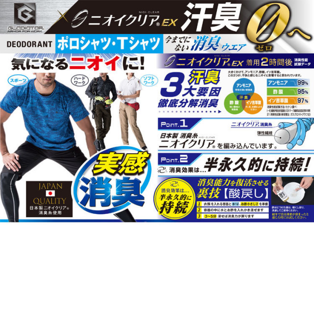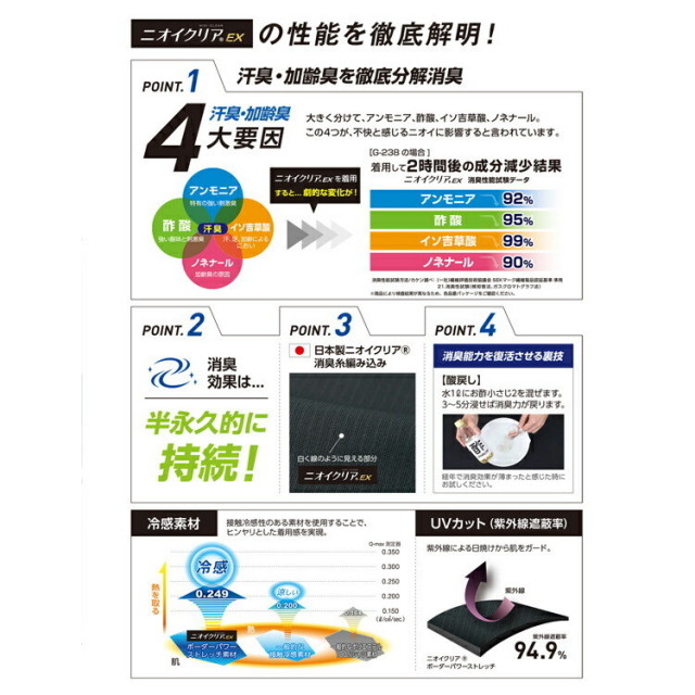 ニオイクリアEXの性能により、不快なニオイ成分を含む汗を繊維の力で瞬時に"水"に分解、無臭化へ。